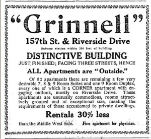 The residents of the Grinnell, a land-marked cooperative apartment house at 800 Riverside Drive in the Audubon Park Historic District, will begin a year-long celebration of their building’s centennial on June 10, 2010.