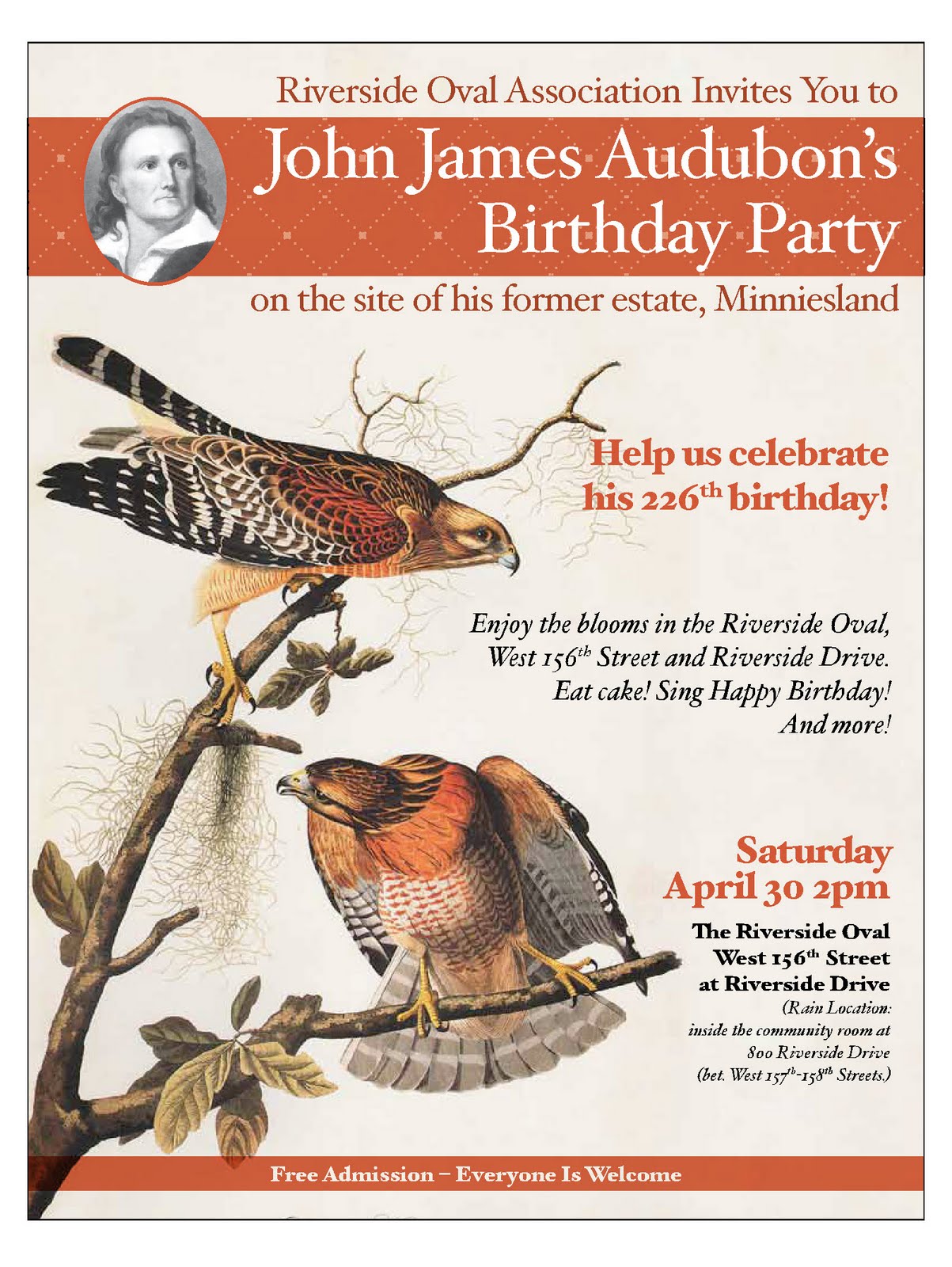 Everyone is welcome to join members and friends of the Oval Association for cake, beverages, and a hearty chorus of “Happy Birthday” to Audubon: admission is free.