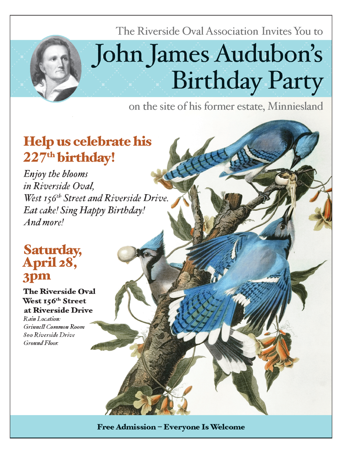 Everyone is welcome to join members and friends of the Oval Association for cake, beverages, and a hearty chorus of “Happy Birthday” to Audubon: admission is free.